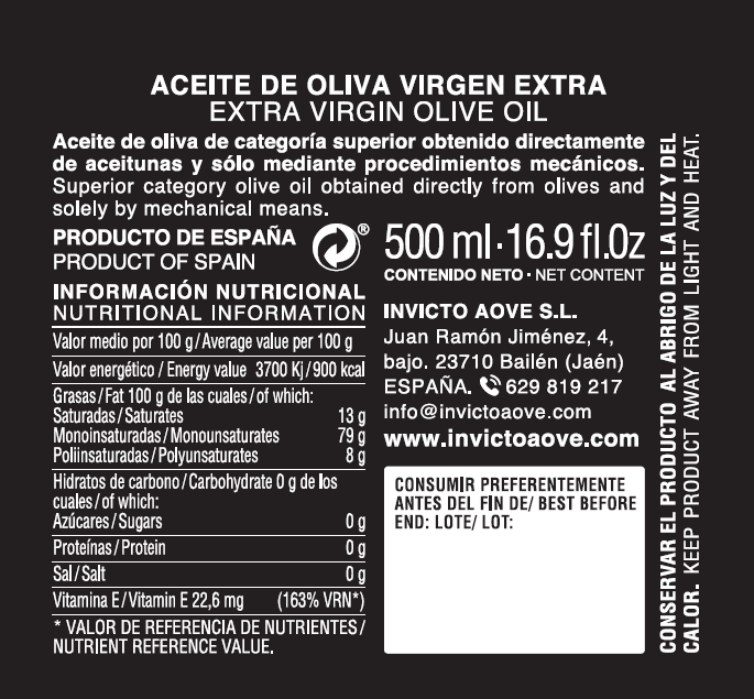 En la cara principal, se encuentra el nombre de la marca, INVICTO AOVE, con un diseño que refuerza la exclusividad del producto. Esta presentación frontal es impactante, clara y centrada en dar protagonismo a la marca y a su identidad.